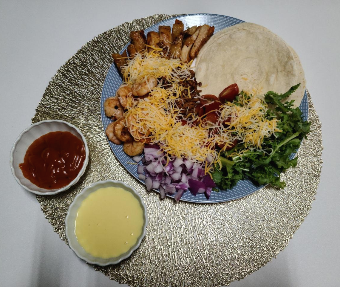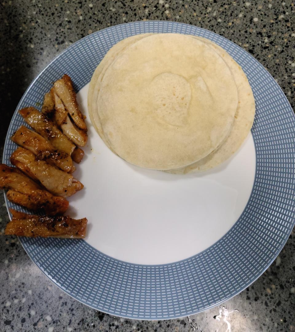 조리하면서 바로 플레이팅을 했어요. 구운 또띠아 먼저 올리고 그 옆에 다 구운 치킨을 잘라서 플레이팅 해주었어요.